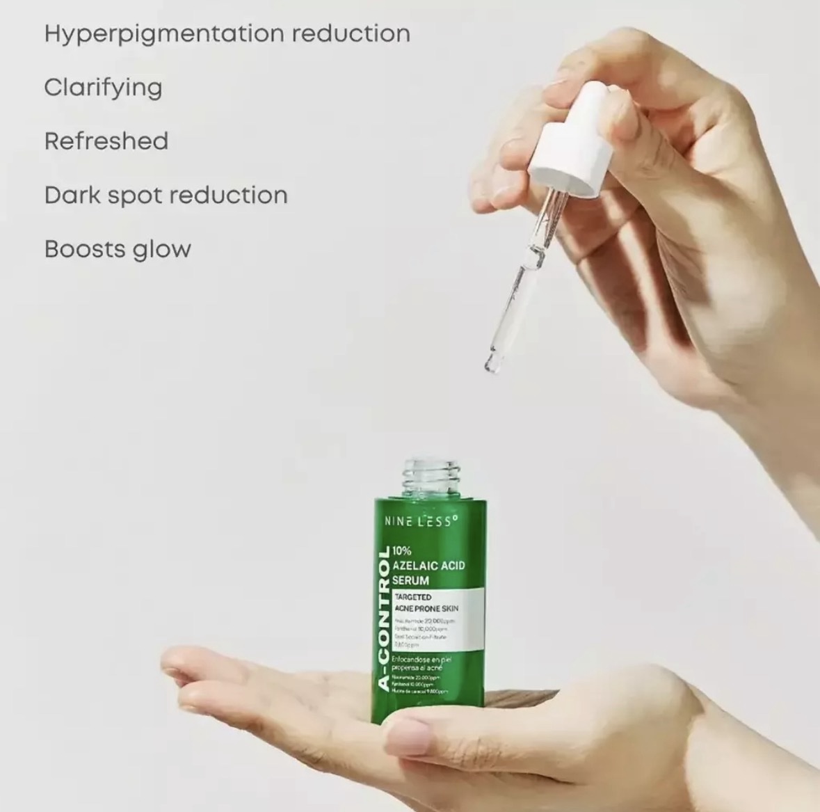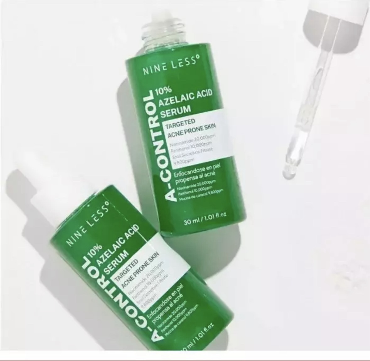 Suero azelaico al 10 % de NINELESS, una fórmula potente que ayuda a iluminar y emparejar el tono de la piel a la vez que reduce la aparición de imperfecciones y líneas finas. Este suero es perfecto para personas con piel propensa al acné o hiperpigmentada y es adecuado para todo tipo de piel. Contiene una potente combinación de extracto de centella asiática, ácido azelaico y niacinamida, que actúan en conjunto para aliviar la piel irritada.