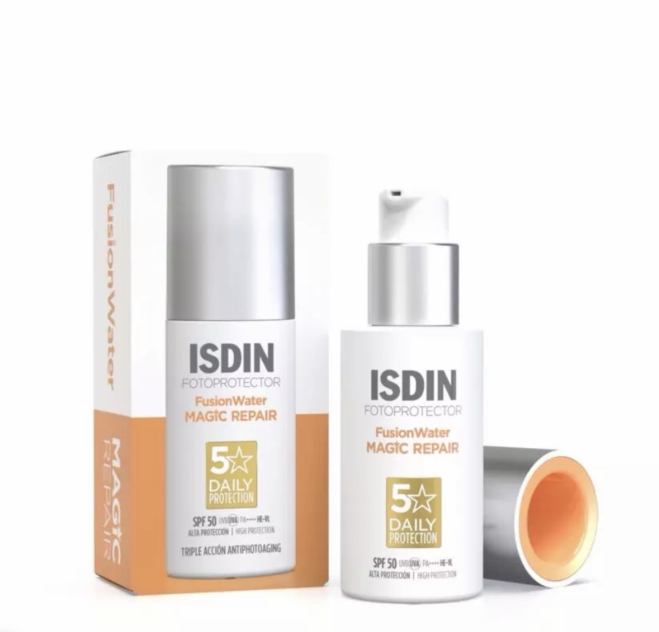 Isdin Fusion Water Magic Repair es un fotoprotector facial de uso diario con textura acuosa que se absorbe al instante sin dejar residuos. Su fórmula está diseñada para quienes buscan una protección solar confiable y una experiencia sensorial agradable. Es ideal para usar bajo el maquillaje o como parte esencial de tu rutina de día.